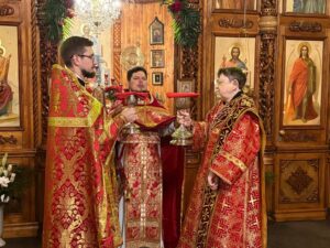 Ему сослужили: ключарь собора иерей Иоанн Толмачёв, протодиакон Александр Якушев и диакон Кирилл Нарушин.