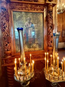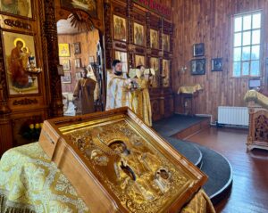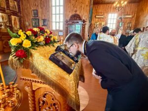 После заамвонной молитвы иеромонах Силуан с духовенством и молящимися воспели славление и вознесли молитву перед иконой святителя Николая чудотворца и «Крестом-мощевиком» в котором хранится частица святых и многоцелебных его мощей!